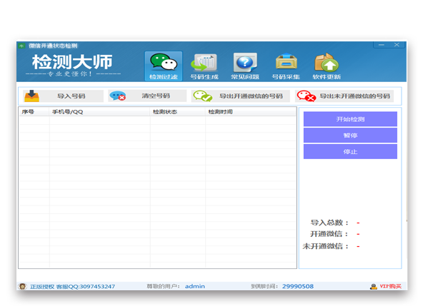 采用腾讯官方技术接口,实现整个检测筛选操作,无需担心检测号码的准确性,确保检测出来的号码都是绑定过微信的。